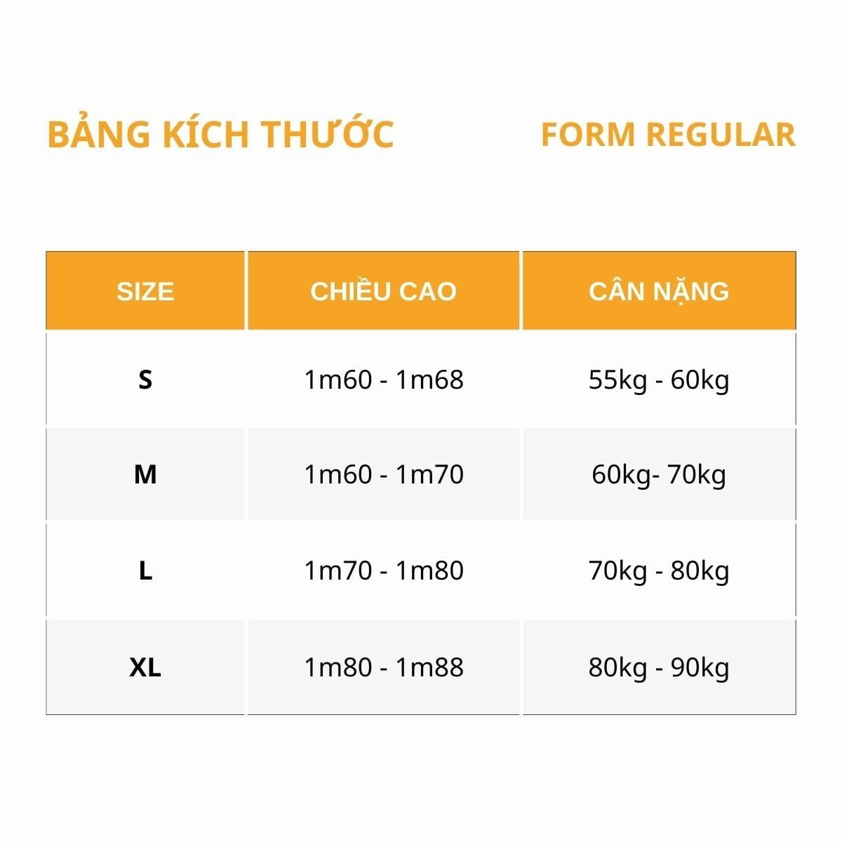 | Cân nặng (kg) | 50-60 | 61-65 | 66-70 | 71-75 | 70-80 | 81-85 |