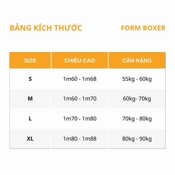 | Cân nặng (kg) | 53kg - 60kg | 60kg - 68kg | 68kg - 78kg | 78kg - 85kg |