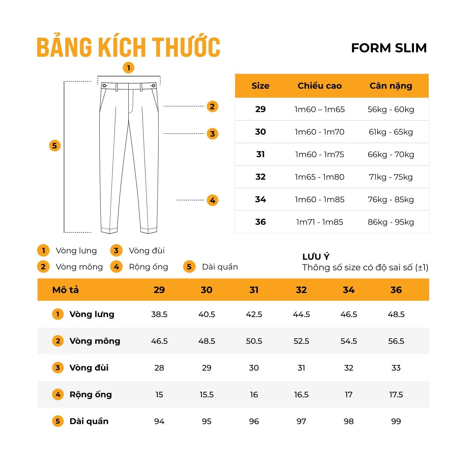 | Dài quần (cm) | 93 | 94 | 94 | 95 | 96 | 96 |