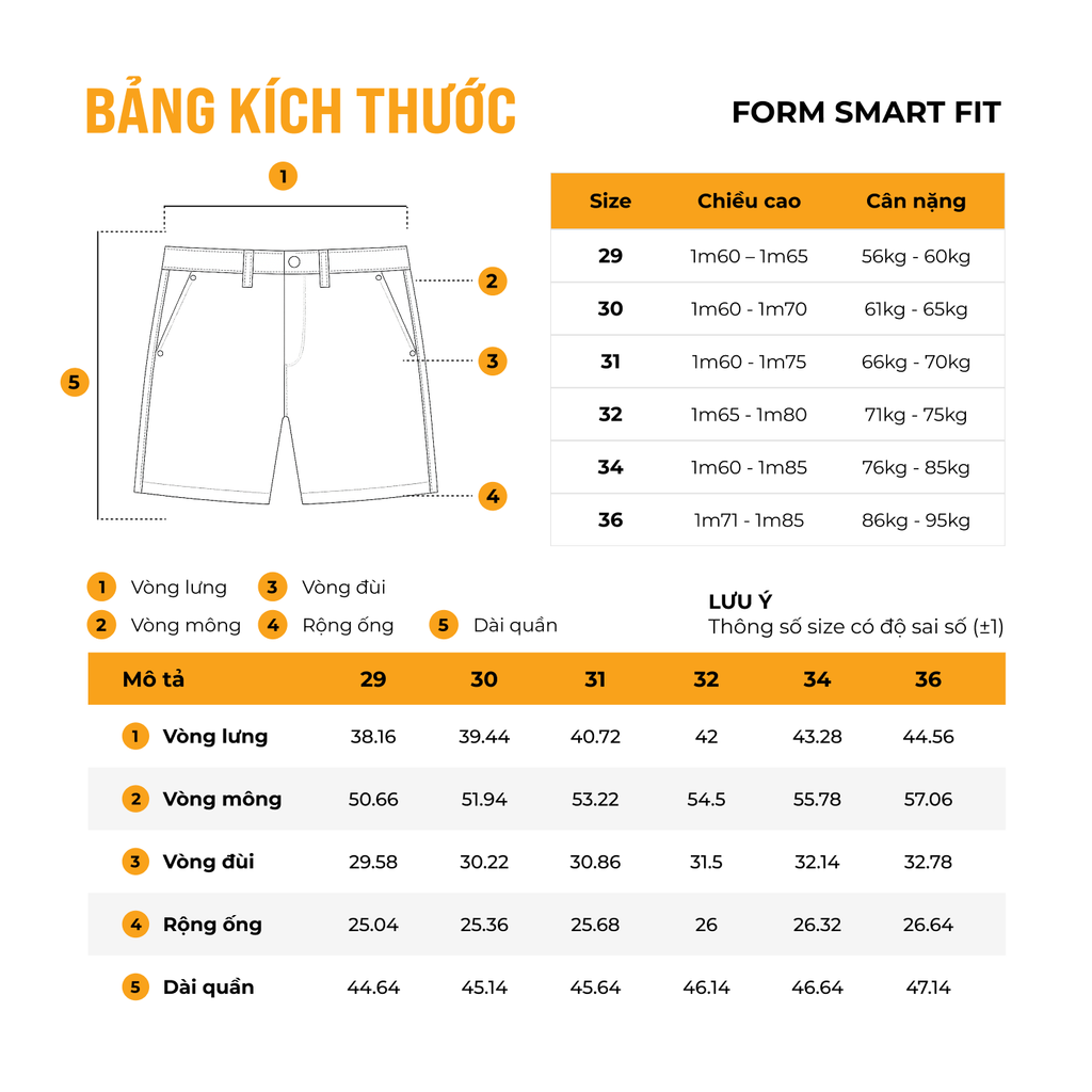 | Dài quần (cm) | 96 | 97 | 98 | 99 | 100 | 101 |
